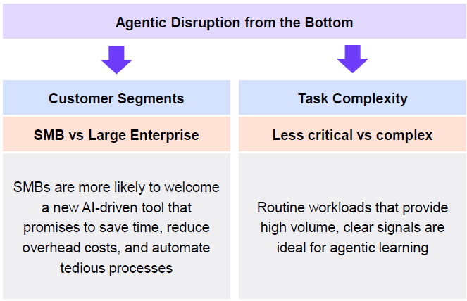 This happens because AI is often strongly subject to a quality feedback loop in which better data produces better quality. This feedback loop exacerbates classic technology trends (outlined in Clay Christensen’s Innovator’s Dilemma) in which new, immature technologies gain powerful footholds with small, classically underserved customers – “disruption from the bottom.” AI agents that can leverage bottoms up disruption to gain early quality have an opportunity to convert their early leads into a persistent technical advantage.